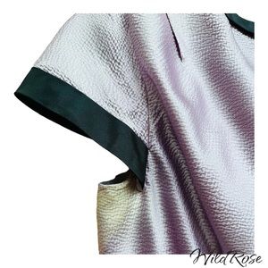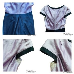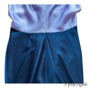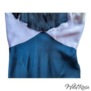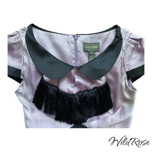 Stunning Zac Posen “Marilyn Dress.” The bodice is a textured silk blend in a light purple lilac hue. The bottom half of the dress and fringe at bust contrasts in a deep navy blue. Black school girl collar and lined sleeves. The centerpiece of this dress is the gorgeous blue tassel at the bust that swooshes slightly as you walk. Darted at the waist and hips. Fully lined. This dress flows flatteringly down the female form. Stunning!!