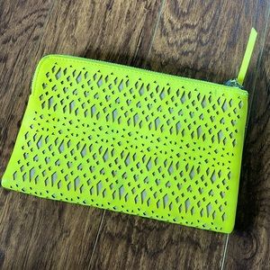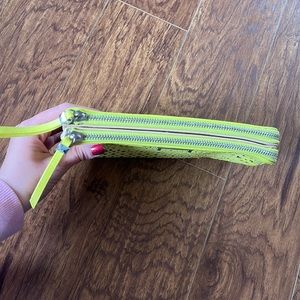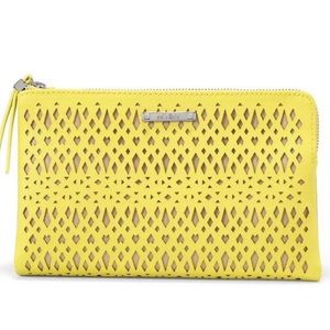 Beautiful double zippered clutch, perforated/laser cut design, mirror inside buttoned compartment, multiple card pockets. Size is 9” x 5.5”