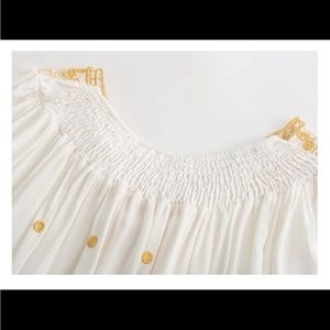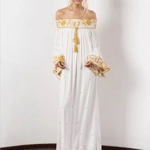 This gown is dreamy and embodies romance with its beautiful gold leaf embroidery accents throughout.