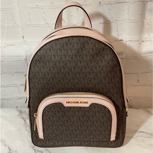 Pink background exterior, pink fabric lining interior, zip closure and additional zip closure in interior pouch, 3 compartments total