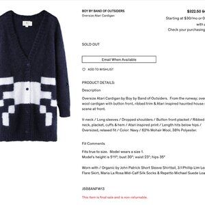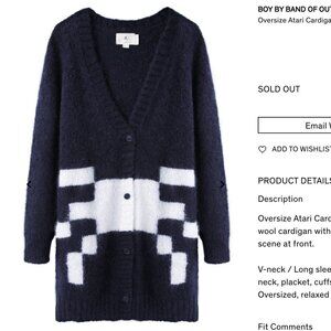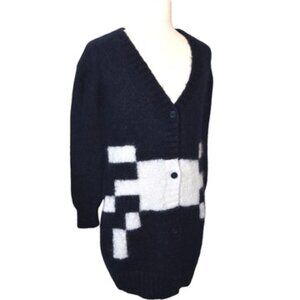 V-neck / Long sleeves / Dropped shoulders / Button front placket / Ribbed knit at neck, placket, cuffs & hem / Atari inspired print / Length hits below hips / Oversized, relaxed fit / Color: Navy / 62% Mohair Wool, 38% Polyester.