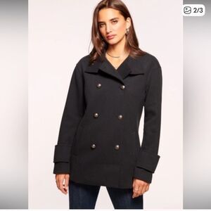 This Ramy Brook peacoat showcases a timeless design with its structured silhouette and luxurious black fabric. The gold accents add a touch of elegance, while the wide notched collar enhances its classic appeal. Ideal for cooler weather, this coat offers both style and warmth.