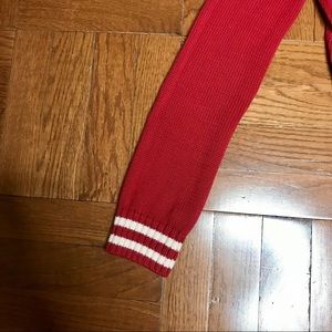 Excellent condition, vintage red knit sweater with hoodie,white trim detail, 2 front pockets, center front zipper, and 2 snap closures. Sweater fabric has stretch. Comes from a smoke-free/pet-free home.