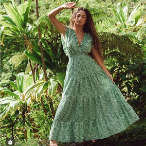 Two button behind neck Open back with tie closure Front middle slit Flowy, super adorable for spring & summer!