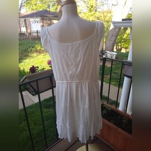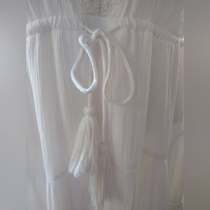 This is the PERFECT beach vacay dress. NWT Off White (Gardenia) gauze dress with tassel tie elastic waist and lovely crochet trim. Can be worn on or off the shoulder. Fully lined and not see thru. Hits above the knee. Bridal brunch, honeymoon, graduation...it will work for them all.