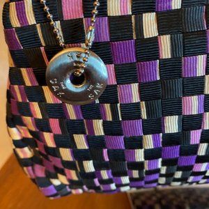 Pre-owned: good condition. Width-13 in, Height-7 in, Pattern-Geometric, Closure-Zip, Handle/Strap Color-Purple, black, white, size medium, handle style, shoulder strap, Strap drop 9 in, features, has inner pockets, lined mobile phone pocket.