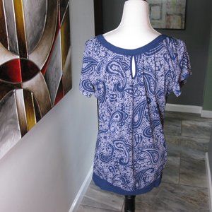 This top is in excellent condition. It has a paisley print with keyhole at the neckline in the back. This top has a soft lightweight texture, very cute. Material/Care tag is missing. The material has stretch.