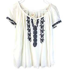 This is a top from Forever 21. It’s a size medium. The colors of the top are blue and white stripes. Style is a fitted v-neck top with buttons (they don’t unbutton). Does shows signs of piling.