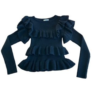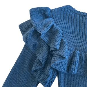Features luxurious alpaca & silk-blend ribbed fabric, tiered ruffles with peplum-like style, crew neckline, long sleeves, & slim or fitted bodice.