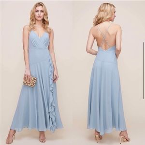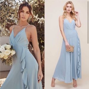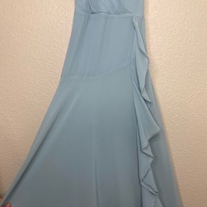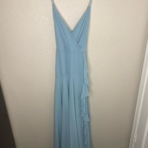 Beautiful, delicate blue maxi dress with ruffle detail across the front. The straps are adjustable.