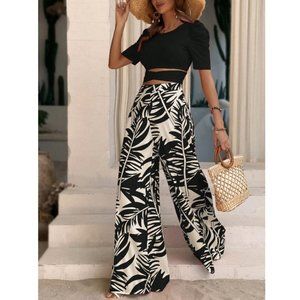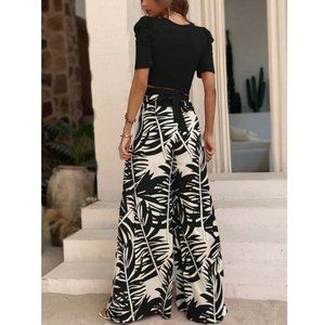 Black Boho Coord set tie Back Tee & Tropical Print Wide Leg Pants