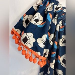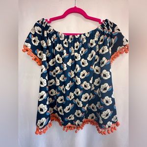 Joy Joy Blue Coral Floral Print Off The Shoulder Top with Pom Pom Fringe- Small