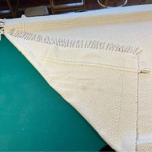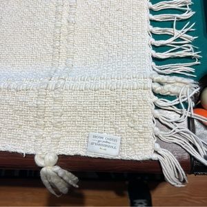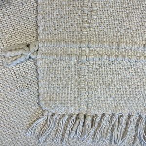 This throw blanket by threshold, studio McGee is made of cotton and acrylic 50-50 material. It is an off-white color , textured design thick blanket with fringe on the edges. This measures 60 x 48“ or 5‘ x 4‘ and is used but in good condition, with some tiny pulls in the knit
