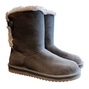 Waterproof synthetic uppers; top elastic drawstring, front strap with hook-and-loop closure for adjustable fit. Insulated removable liner, fabric boot lining, cushioned footbeds, and synthetic lug soles.