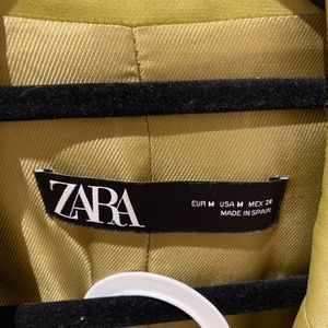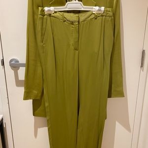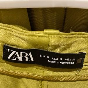 Zara satin chartreuse/mustard blazer and cropped pants. Jacket is size M (approx AU 10/12) and pants are size S (approx AU 10). Worn only twice, gorgeous structured jacket with slightly oversized fit and cropped pants just above ankle. Beautiful soft satin fabric. Virtually no wear or tear, has been freshly dry cleaned.