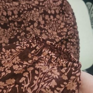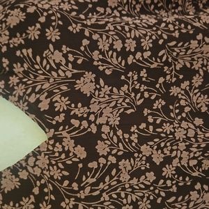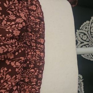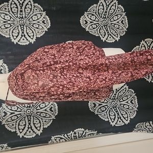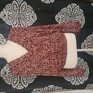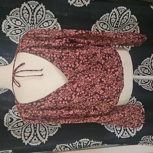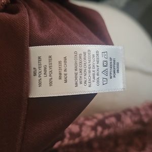 burgundy background lined w sheer sleeves, pink floral pattern. gathered waist, v frt and back. tie in back. like new condition