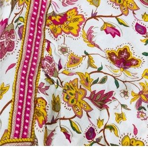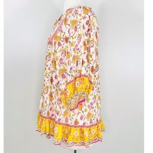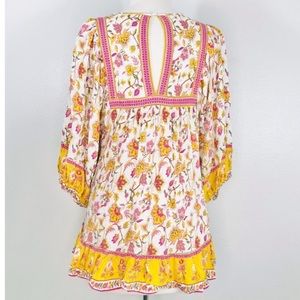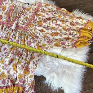 This, Rachel, so dress reminds me of a spell, the gypsy dress. Could be worn as a tunic or a mini dress if you wore shorts underneath. Blouses sleeves with an elastic rest. Muted mustard‘s pinks and greens create the floral design and the neckline ties with tassels. Cute little ruffle at the bottom and an open keyhole back design.