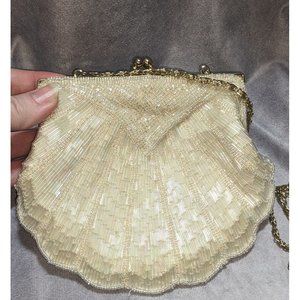 Gorgeous vintage hand beaded glass clam evening bag by La Regale. It's in the shape of a clam shell, and the beads have a slight rainbow aurora borealis finish. It has gold tone hardware and a kiss lock closure. It has a gold chain strap that can be used, or it can be tucked into the bag so you can use it as a clutch. This oozes old Hollywood glam, and it's perfect for mermaid themed outfits!