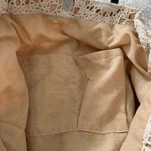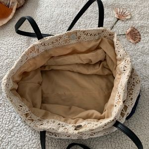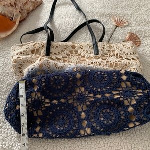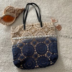 This is a great bag for a day at the beach! Large enough to hold all your essentials. Crochet on the outside, the bag is fully lined. Top snap closure. Inside there is one zipper compartment, and 2 pouches. The interior is clean, no marks or stains. Faux leather handles. Bag is approximately 18"x17"'x6". Strap drop