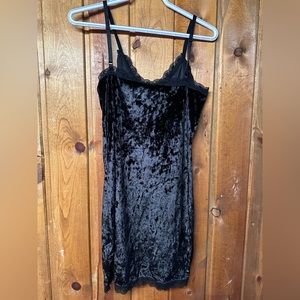 Lace-trimmed velour slip dress. Sleeveless with adjustable straps, V-shaped neckline, and shaped cups.