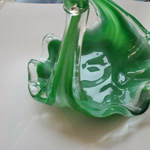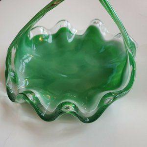 Vintage Green Depression Glass Unique Curved Swirl Candy Dish w/Handle 8 x 7 x 6.