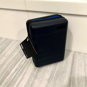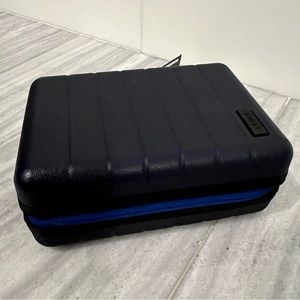 case - navy blue with bright blue zipper 6.5" x 4.5" x 2.5".