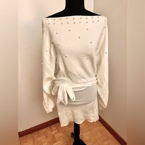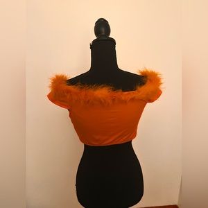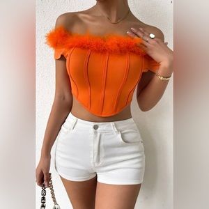 SHEIN SXY Fuzzy Trim Off Shoulder Asymmetrical Hem Crop Tee