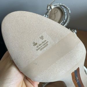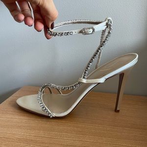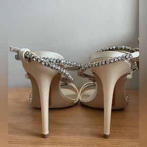 Never worn; cream satin with rhinestone embellishment; approx. 3.5in heel