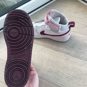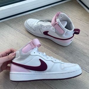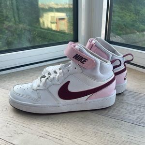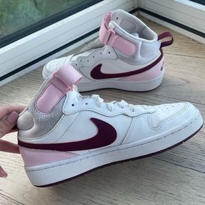 Nike high top ‘all day play’ sneakers! Size 6Y, equates to a women 7.5-8. Super cute pastel pink and maroon details! Perfect casual shoe, gym shoe or athletic shoe! Pink and white mid sneakers!