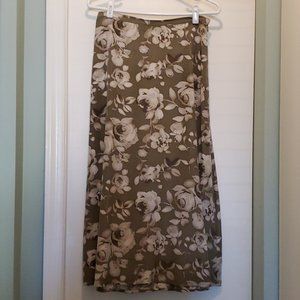 Long slightly A-line sage green floral skirt. 100% silk. Side zipper. Size 8 petite. Excellent condition.