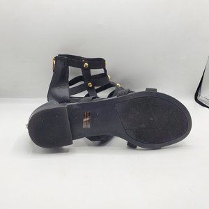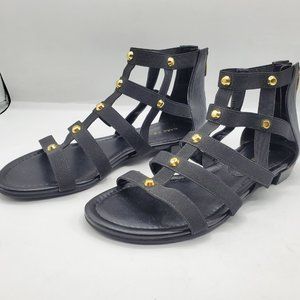 Pre-loved but in like new condition black gladiator sandals with gold stud accents and back zipper. Size 8.