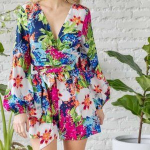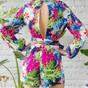 Medium Flower print V Neck Romper open back with belt