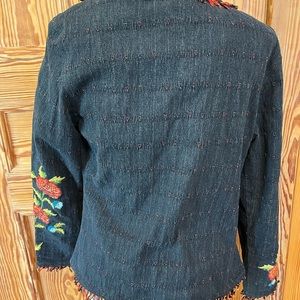 This fringe-trimmed, lavishly embroidered, sequin-studded denim blazer is a funky, free-spirited showstopper! Size Small will fit 8 to 10. Pair it with denim or orange dress or trousers to make a fun outfit that can be dressed up or down. Fully lined. Made in Nepal of interestingly textured dark blue denim, it has two functional front patch pockets. Dry clean only.