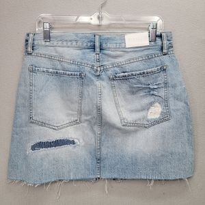 Light wash distressed denim skirt with raw hem and patchwork details. Size 30, new with tags in excellent condition.