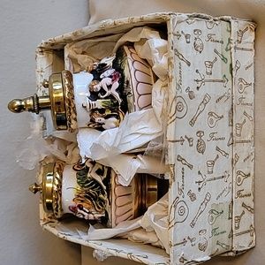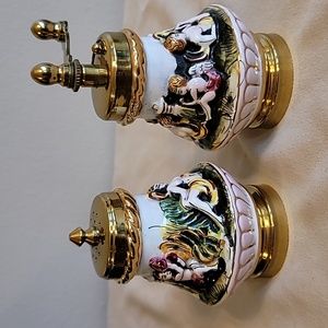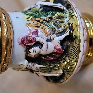 Rare Vintage Capodimonte Porcelain And Brass Salt Shaker And Pepper Grinder. New in packaging. New in box. Beautiful porcelain hand painted Italian salt and pepper grinder. Images of cherubs in bright colors. Measures: pepper grinder is 5” tall x 3” wide at widest point, salt shaker is 4” tall and same width. Please review pictures for additional information. Comes from a pet-free and smoke-free environment