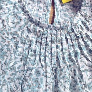Super light tunic with pleating around neck and wrists. Button loop at back of neck has come off on one side - priced accordingly. Should be easy fix.