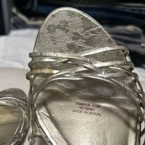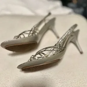 Stunning strappy sandals, perfect for special occasions! Beautiful foiled metallic color looks like a pale champagne that is neutral enough to go with any fancy outfit. Straps fit a wider foot, slight wear, great condition, 2.5” stiletto heel. No original box.