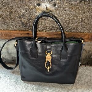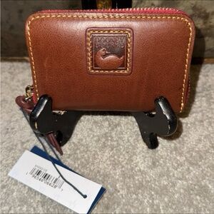 Print pattern features Disney Princesses depicted on Mickey Mouse ear hats. Screen art on textured grain leather. Stitched leather trim. Fold over flap with magnetic closure. Zip closure with leather strap pull. Two interior open pockets. Four credit card slots. Fully lined in hot pink. Gold hardware. Dooney & Bourke 1975 leather and gold name plate on front.