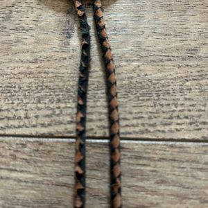 Vintage leather bolo. Unique detailing and a cool horseshoe design. Small amount of fraying on the leather where the bolo slides, doesn’t affect the wear.