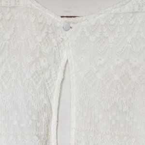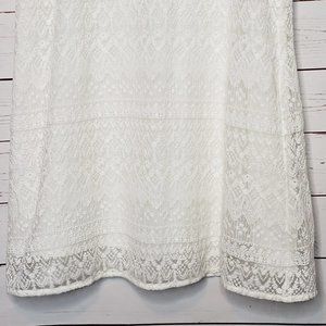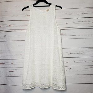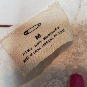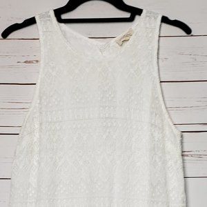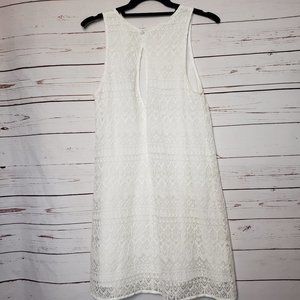Pins and Needles Dress. White. Lace Overlay. Fully Lined. Sleeveless. Back Keyhole Detail with Button Closure at Neck. Back Hidden Zipper. 70% Cotton 30% Nylon. Lining: 100% Polyester. Good Preowned Condition. Size Medium. Flat Lay Measurements: Chest 16" Length 33.5" I-715