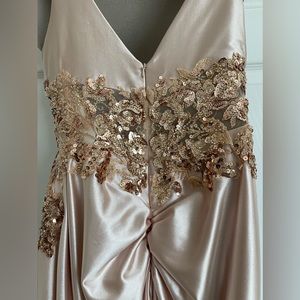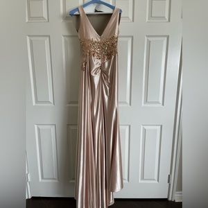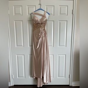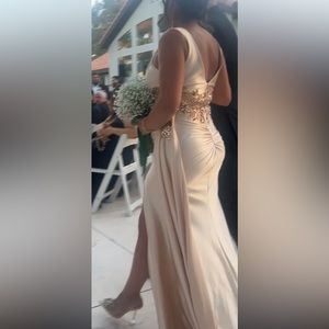 Champagne Maid of Honor or Bridesmaid dress with train. Worn once. The slit has a slight tear. Material is Polyester, fits like quality stretchy satin, and super flattering from behind. Custom cups inserted, no bra necessary. Gold detail at midriff. Size 6. Despite label claim, it dry cleaned just fine.