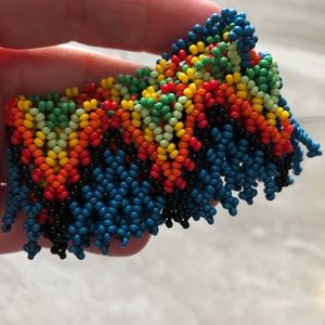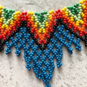 The necklace is constructed with colored beads combined to form exclusive and unique designs approximately 15 inches long with closure at the end