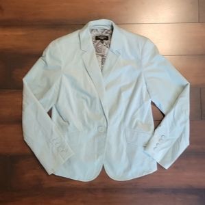 Talbots Woman's Blazer Jacket. Light Teal color on the outside with a suade feel. Cool print on the inside. Two pockets on the front. Pair this blazer up with jeans or a spring dress. Size 12P.