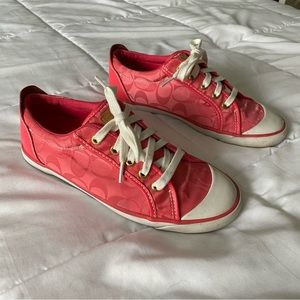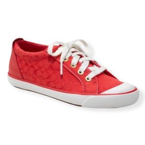 All over Coach signature print. Lace-up closure with gold eyelets. Leather and textile upper, a rubber sole, a cushioned insole for comfort. Coach badges on the tongue and heel.