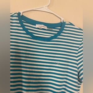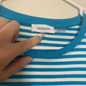 Calvin Klein dress - size XS - teal blue and white straps, material shown in picture. silver CK in top right corner. I’m great preowned condition.