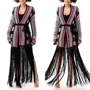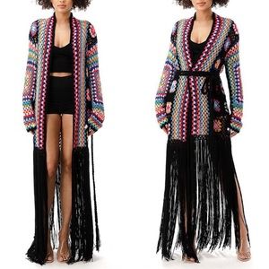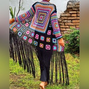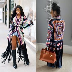 If you know me you know I love a good cardigan. This gorgeous black granny square crochet cardigan has a maxi length, waist belt and a gorgeous long black fringe skirt. The back of the cardigan also has a huge multicolor crochet square that is gorgeous. This is the perfect cover up for the pool and also a great cardigan to wear if you are heading to a music festival. 100% Acrylic