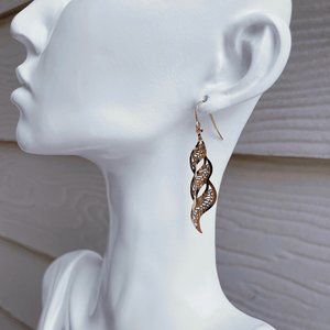Indulge in the captivating allure of these sterling silver drop earrings. Their spiral-shaped design adds a modern twist to a classic silhouette, while the golden complexion brings a touch of warmth and luxury. With their unique blend of elegance and contemporary flair, these earrings are the perfect statement accessory for any occasion. DIMENSIONS: 2 inch. L ; 0.5 inch. W * Dimensions are estimated * Good condition * Please do your due diligence