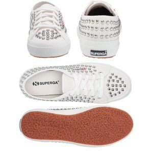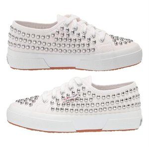 The Classic Superga 2750 unisex shoe with a twist - silver studs! Canvas sports footwear for men and women with unlined upper in extra- strong, fully breathable pure cotton. Outsole in vulcanized natural rubber.