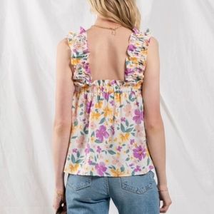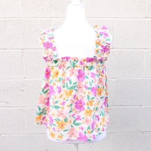 Flowy pink floral cold shoulder top with cinched shoulder sleeves and square neckline. Comes in sizes small, medium, and large.