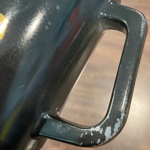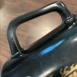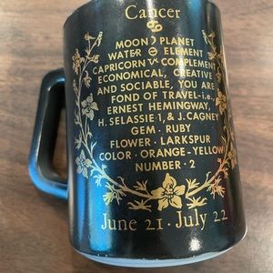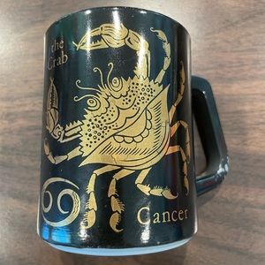 This is a vintage milk glass mug from Federal glass made in the USA. It is black with a gold cancer astrology image for June 21 to July 22. Please note the handle has color loss and there is some staining inside of the mug.